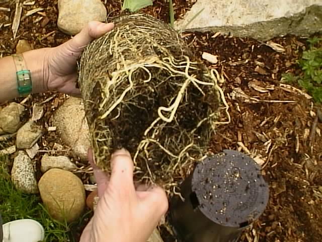 - Plunk a root-bound plant into the ground. Either tease apart the roots a bit or lightly score the sides with a sharp knife, which inspires new root growth. Then you may place the perennial in its planting hole.